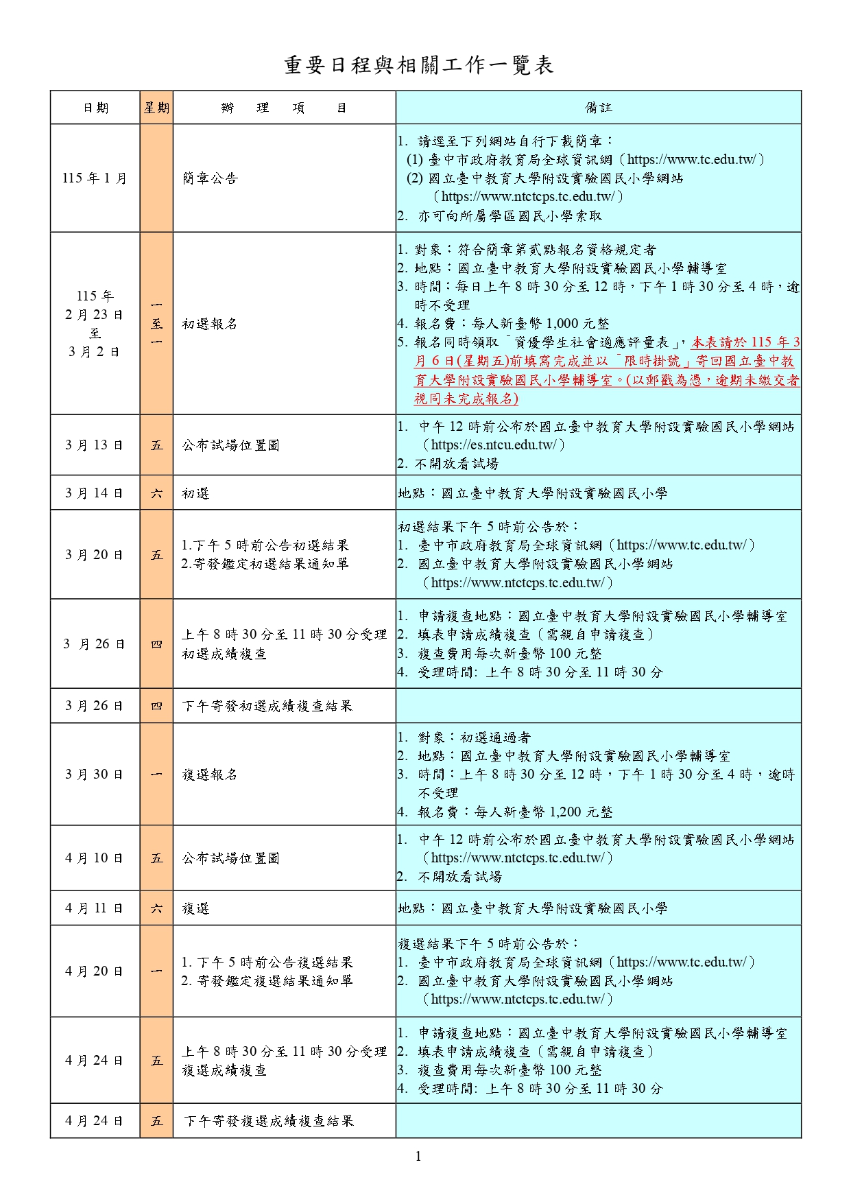 ⭐臺中市特殊教育學生鑑定及就學輔導會重要日程與相關工作一覽表: