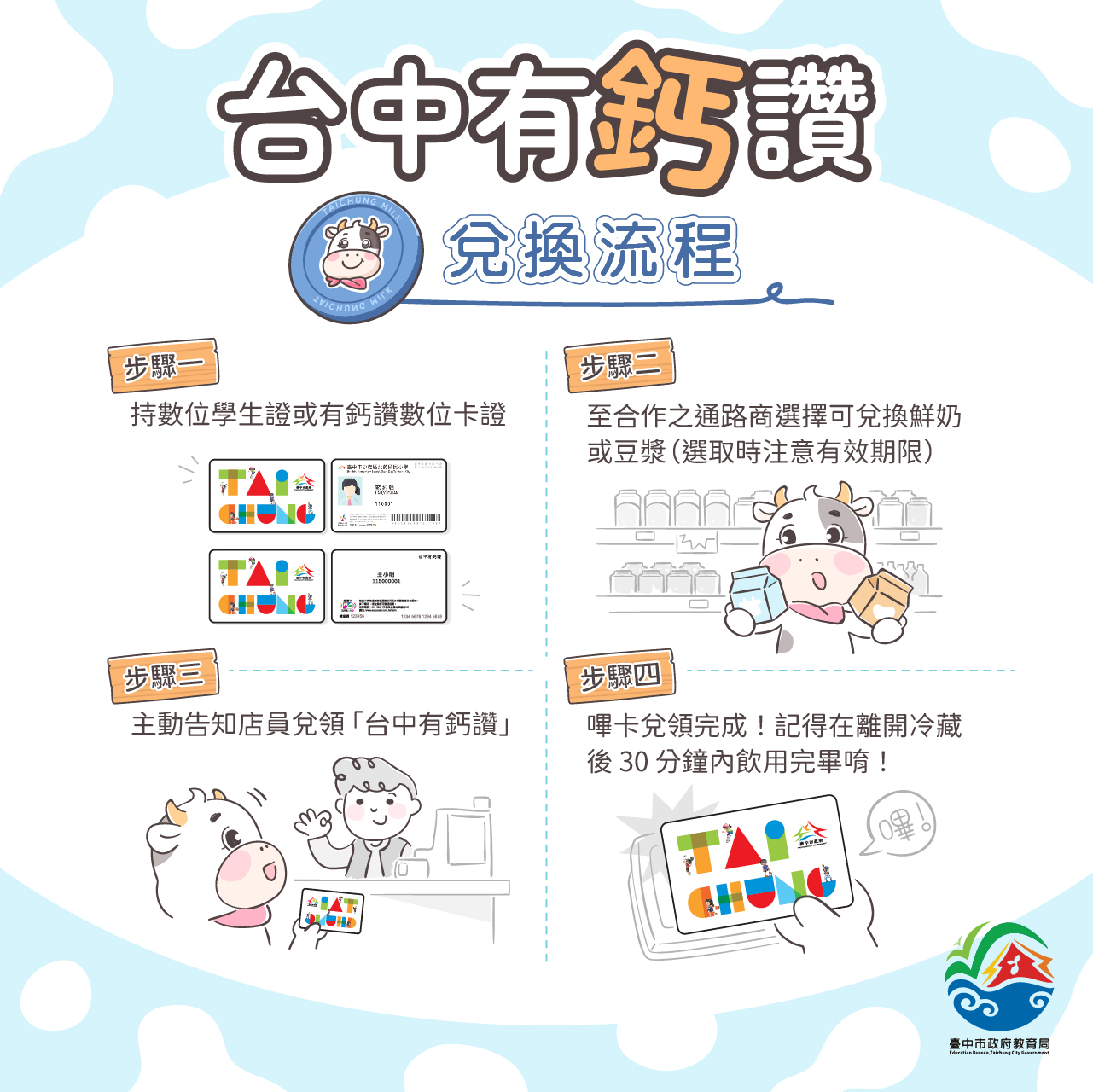 三、領用方式:持台中有鈣讚數位卡證至合作通路兌換,如有乳糖不耐症可兌換豆漿。